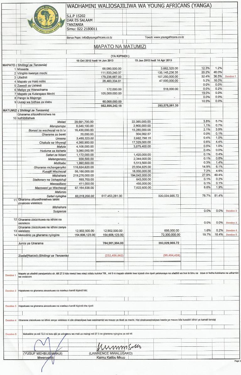 Uongozi wa klabu ya Young Africans leo umetoa ripoti ya mapato na matumizi kwa kipindi cha miezi sita tangu Januari 14, 2013 mpaka Julai 14, 2013 ikiwa ni sehemu ya muendelezo wa kutoa mahesabu hayo kwa wapenzi, washabiki, na wanachama na jamii kwa ujumla.
